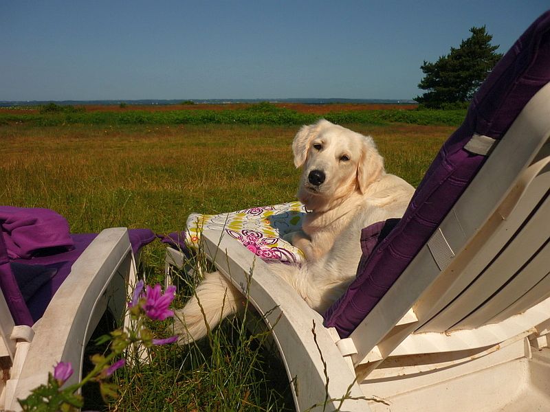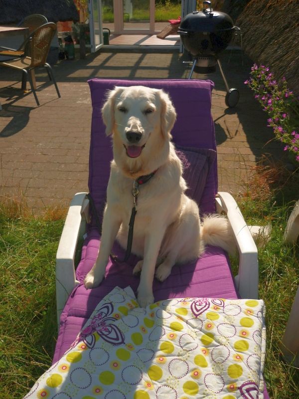 ich bin wieder da! Stell Dir vor, ich bin mit allen gaaanz weit weg gefahren, auf so eine Insel mit sehr viel Wasser drumherum. Die Autofahrt habe ich geduldig ertragen, bin sogar Fähre gefahren und dann haben mir alle unser neues „zuhause“ gezeigt. Ich fand`s prima, da gab es Liegestühle (leider eher für die Menschen….) und eine tolle Aussicht. Ich habe am Liebsten vor dem Haus gelegen und mir alles angeschaut. Das Meer war mir noch sehr unheimlich, vor allem die komischen Wellen, aber mit Henry Zuspruch habe ich sogar dicke Holzteile wieder rausgeholt!