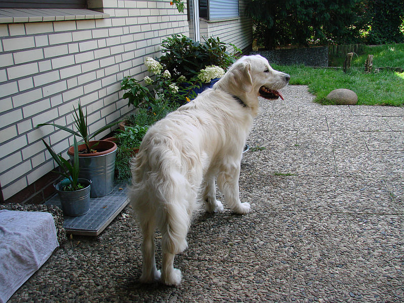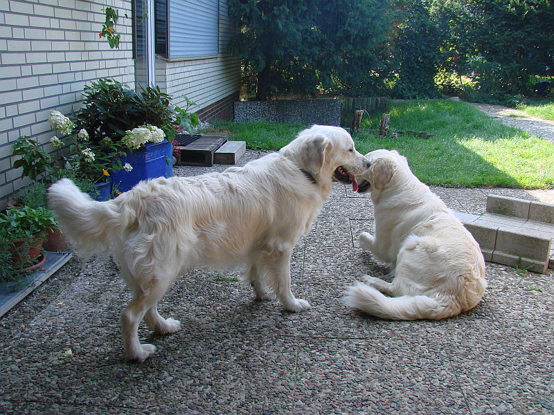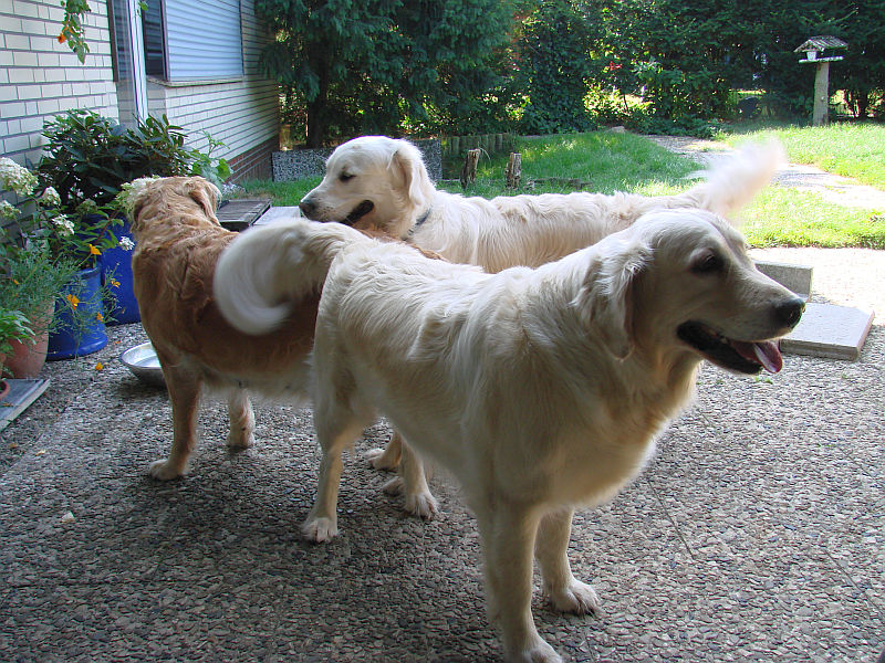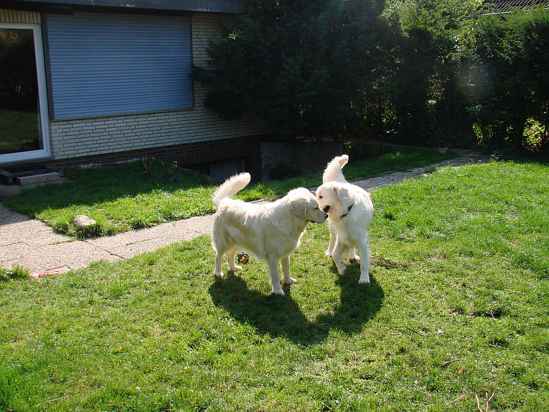 Doch Arielle ist aus der Zucht raus und damit tabu. Morgen werde ich mit Bonita doch zu Henley nach Stuvenborn fahren, damit die Beiden mehr Ruhe haben als bei uns, wo alles- mit zwei läufigen Hündinnen und Arielle, die ihrer Tochter die Show zu stehlen versucht- einfach viel zu unruhig ist.