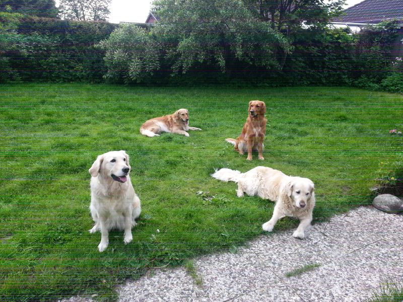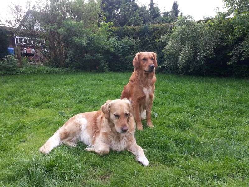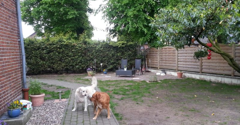 Nach dem wir bei Rüden waren, würde Crazy zu Hause stürmisch von der Hundefamilie begrüsst und neugierig beschnüffelt. Dann erholte sie sich im Garten, wo sie mit den anderen Hündinnen spielte und fleißig für morgen übte! Auch Bonnie und Arielle sind in den Stehtagen- eine sehr explosive Mischung!