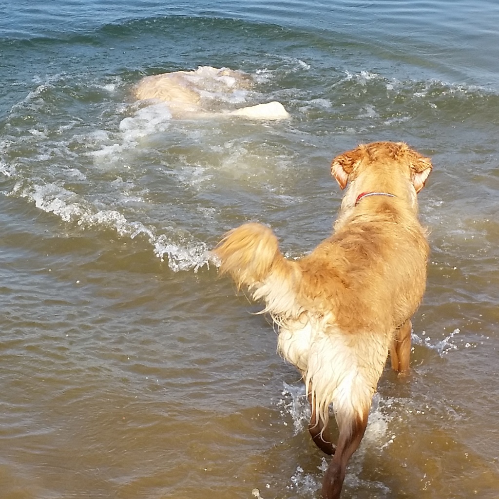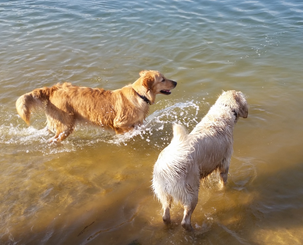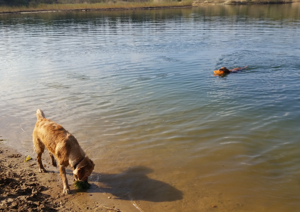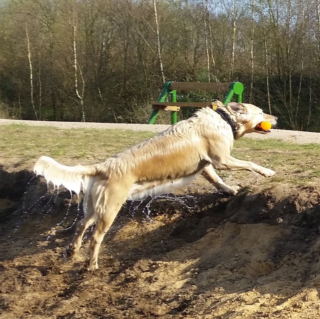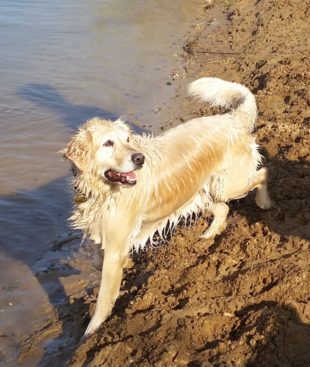 Die erwachsenen Hunde tobten ausgelassen und schwammen viel. Crazy war wie immer auf ihre Scheibe fixiert und Bonnie bellte viel weil ihr immer alles nicht schnell genug ging. Arielle war natürlich sehr gemütlich und holte das alles aus dem Wasser, was die andere Mädels nicht holen wollten. Happy war schon gut drin aber ganz zu schwimmen traute sie sich doch noch nicht. Sie lief hinter den Großen hinterher und wollte ihnen das Spielzeug abjagen,was natürlich nicht funktionierte. Aber sie apportierte schon ein oder anderes mal etwas aus dem Wasser – ging aber nur so weit rein, dass sie noch stehen konnte. Oft aber holte sie etwas und ließ es wieder fallen.