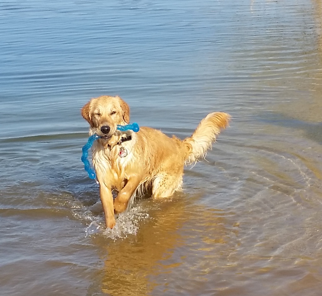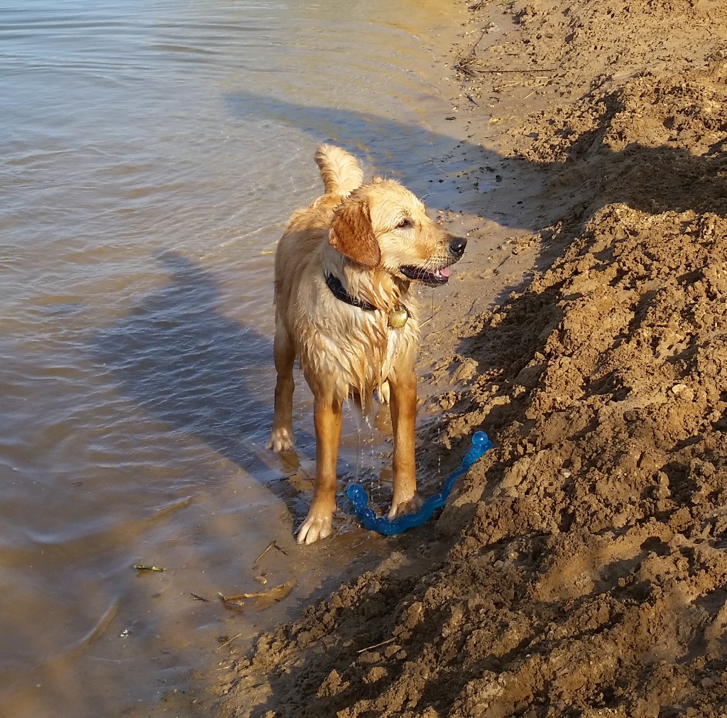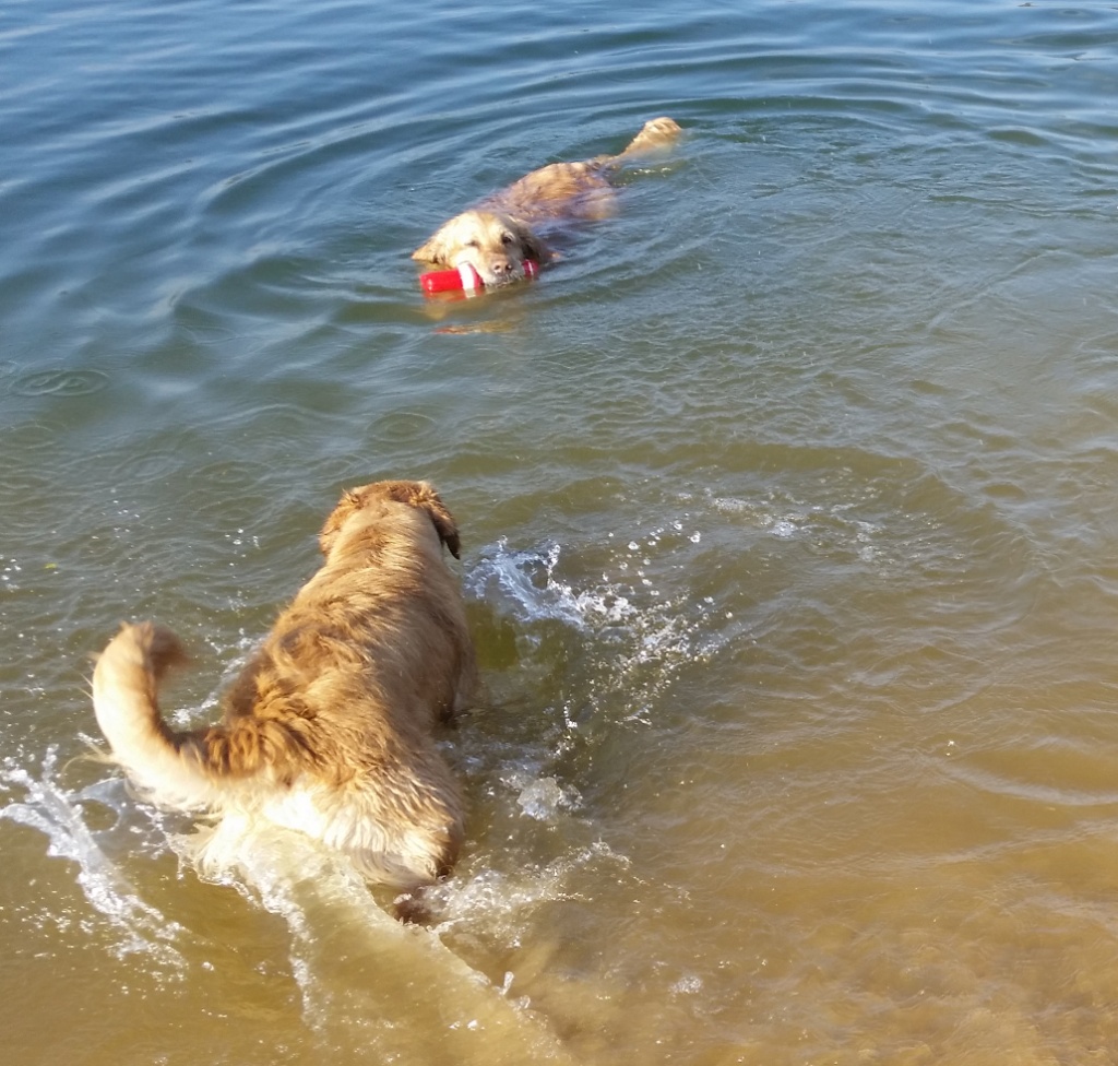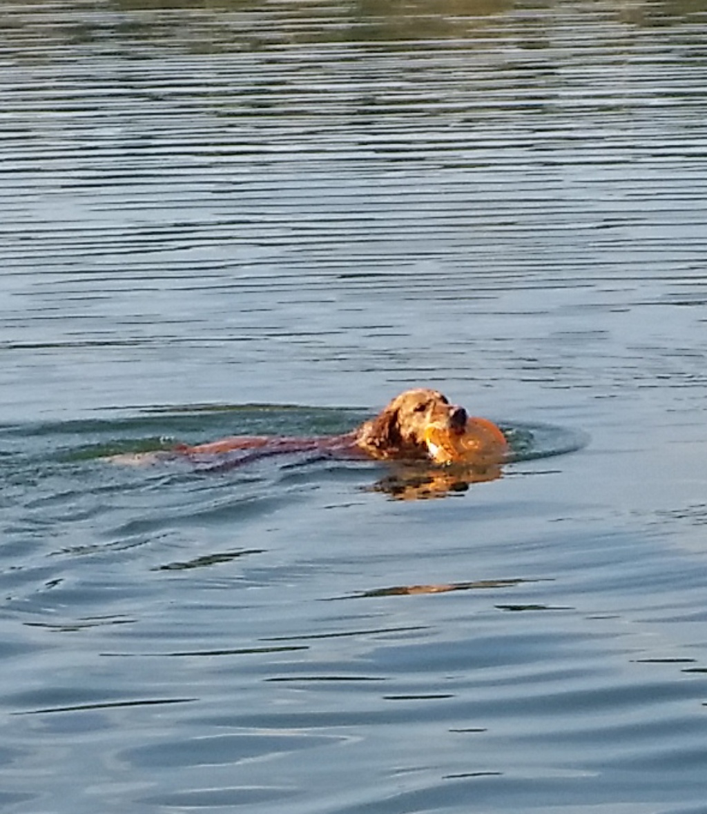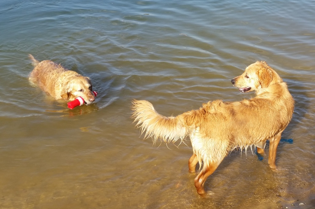 Die erwachsenen Hunde tobten ausgelassen und schwammen viel. Crazy war wie immer auf ihre Scheibe fixiert und Bonnie bellte viel weil ihr immer alles nicht schnell genug ging. Arielle war natürlich sehr gemütlich und holte das alles aus dem Wasser, was die andere Mädels nicht holen wollten. Happy war schon gut drin aber ganz zu schwimmen traute sie sich doch noch nicht. Sie lief hinter den Großen hinterher und wollte ihnen das Spielzeug abjagen,was natürlich nicht funktionierte. Aber sie apportierte schon ein oder anderes mal etwas aus dem Wasser – ging aber nur so weit rein, dass sie noch stehen konnte. Oft aber holte sie etwas und ließ es wieder fallen.
