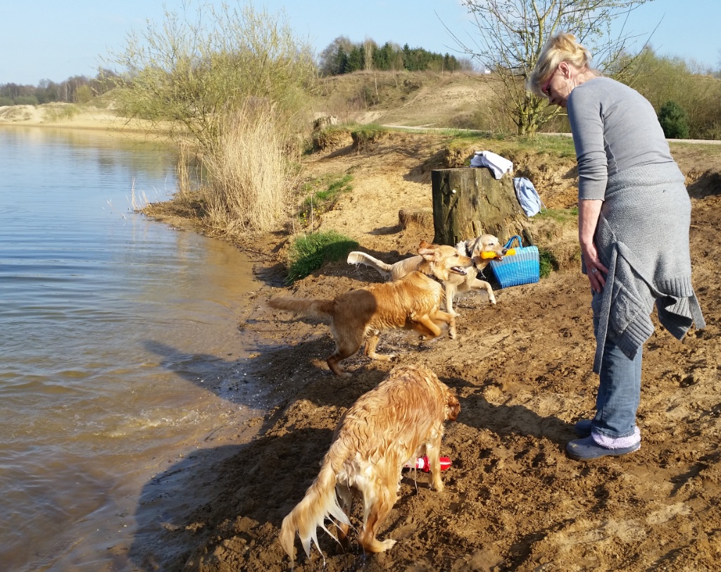 Das war ein schöner Ausflug doch sehr lange konnten wir nicht bleiben weil es doch noch zu kalt ist. Wir haben die Hunde vom Auto abgerubbelt aber Bonita und Ari zitterten trotzdem -so bekam Bonita,die anfällig ist meine Sweetjacke um und Ari ein trockenes Badetuch. Ich hoffe wir werden viele viele Male in diesem Jahr den See genießen können…