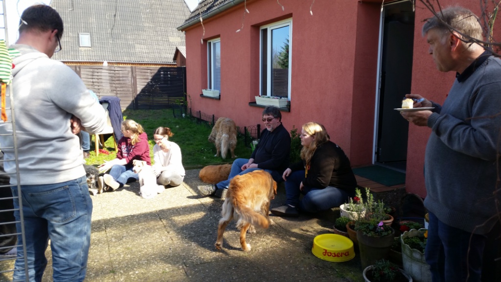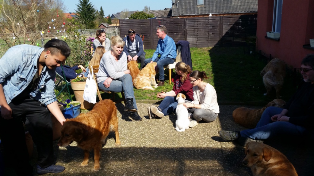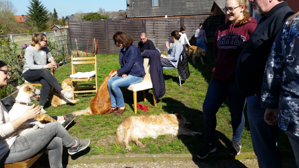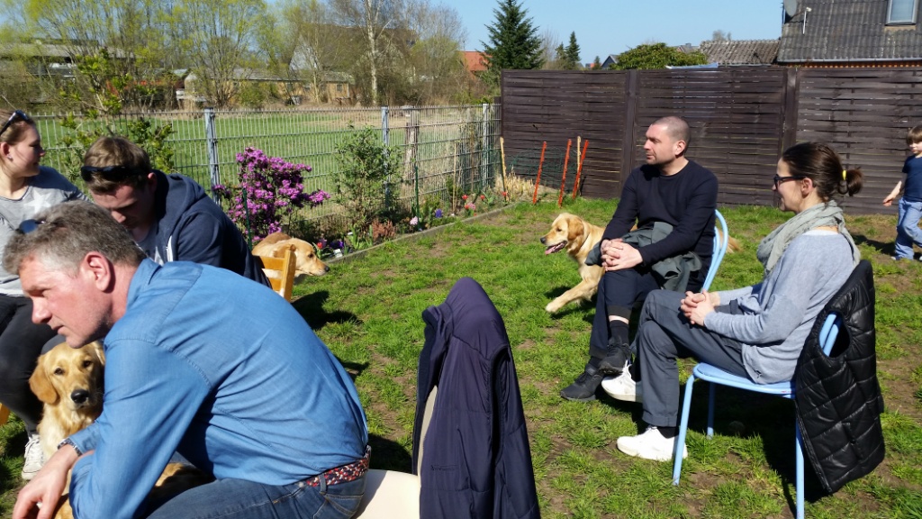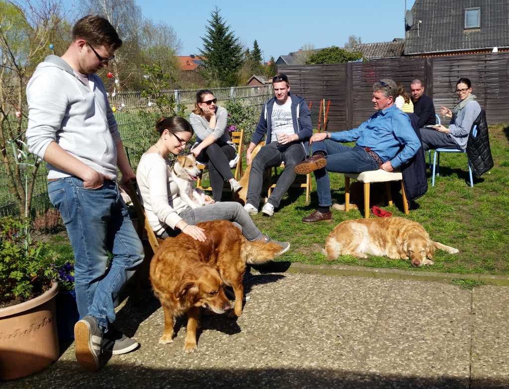 Später, als wir schon bei mir waren,ist noch Hero mit Familie dazu gestoßen. Die Runde bei mir zu Hause und im Garten war sehr entspannt und gemütlich. Es gab viele nette Gespräche, lecker zu Essen & Trinken und die Hunde spielten ausgelassen oder ließen sich von uns verwöhnen.