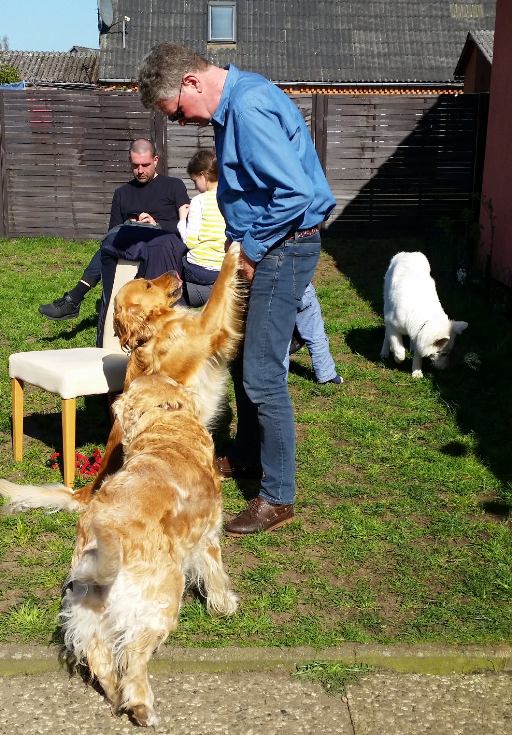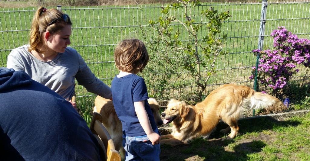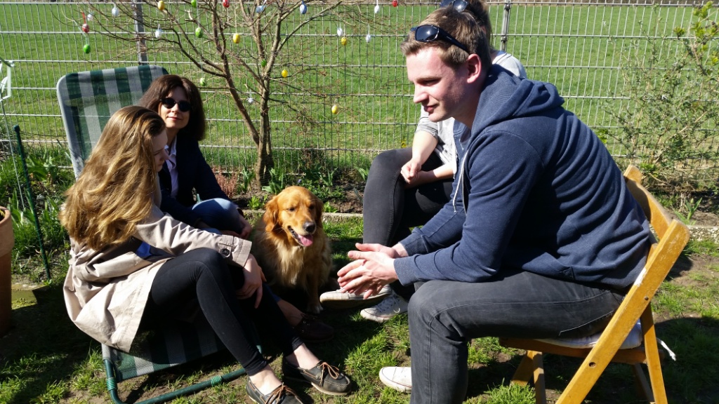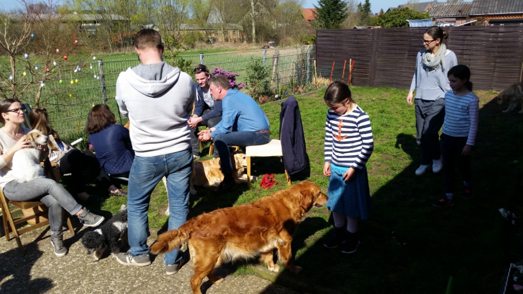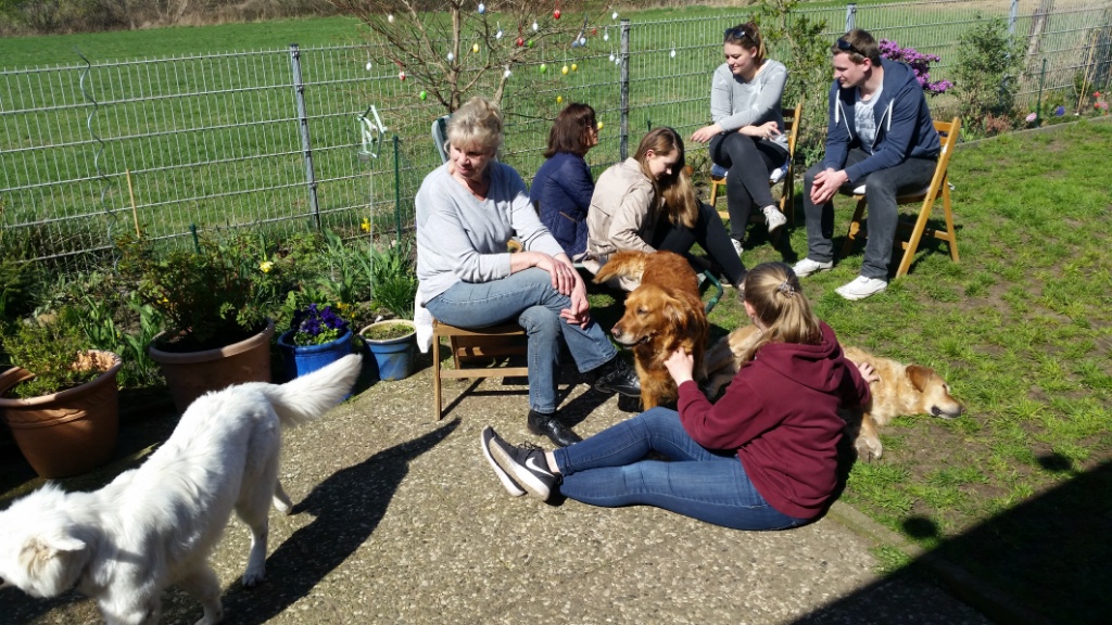 Später, als wir schon bei mir waren,ist noch Hero mit Familie dazu gestoßen. Die Runde bei mir zu Hause und im Garten war sehr entspannt und gemütlich. Es gab viele nette Gespräche, lecker zu Essen & Trinken und die Hunde spielten ausgelassen oder ließen sich von uns verwöhnen.
