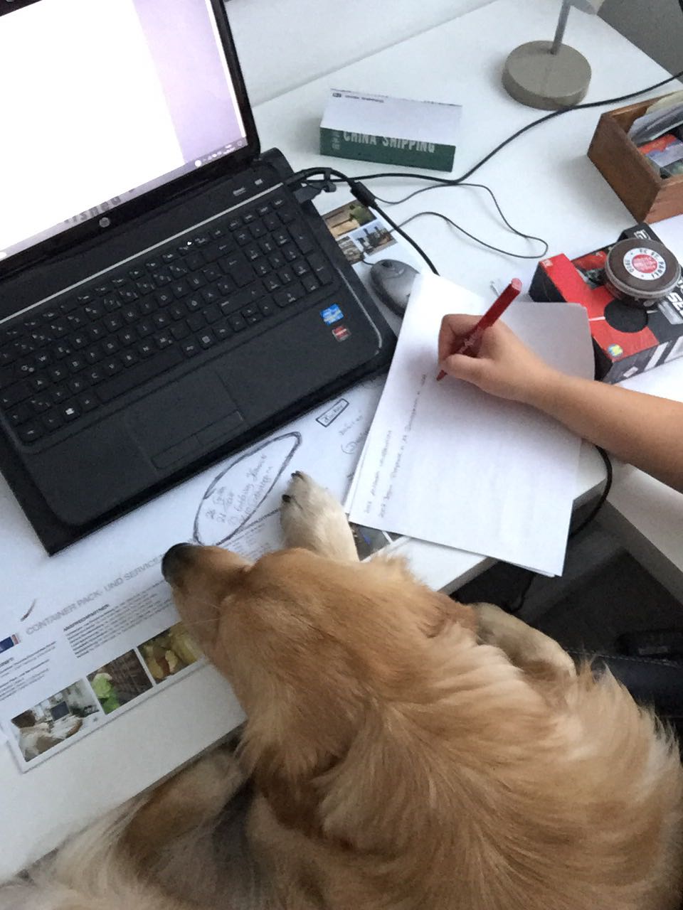 Gestern habe ich lustige Fotos bekommen: Frauchen Desirèe lernt für eine Prüfung und ihr Liebling Hunter weilt treu bei ihr: