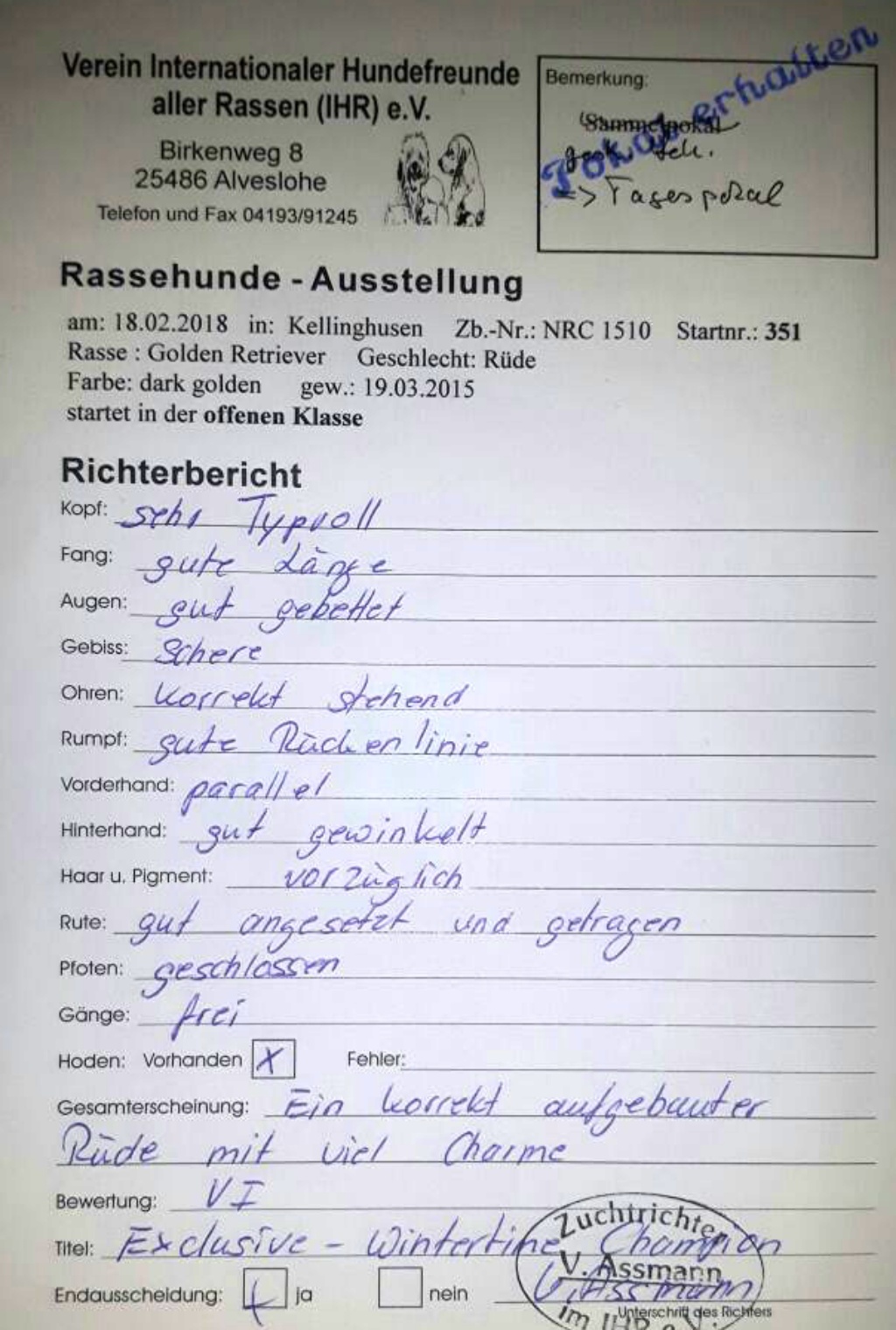Nach der Pause ging es weiter:Die Besitzer von Gizmo und ich freuten ubs sehr, dass der Rüde sich so gut geschlagen hat. Nun soll der Rüde so schnell wie möglich zuchttauglich geschrieben werden, da man auf der Ausstellung schon Interesse an ihm als Zuchtrüden hatte. Er hat schon auch die Zuchtgebühr bezahlt-leider fehlen noch die Gesundheitsergebnisse, deshalb muss Gizmo demnächst offiziell geröngt werden. Ich drücke sehr die Daumen, dass er das schafft. Dann hätte er den ersten Deckauftrag direkt in der Tasche. Und wenn eine Richterin, die viele Goldies auf den Ausstellungen sieht, ihn buchen möchte, dass spricht für sich -oder?