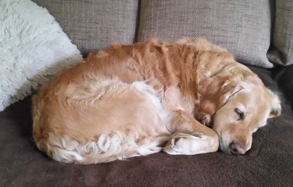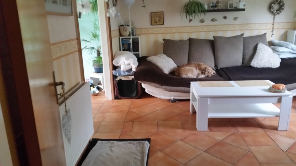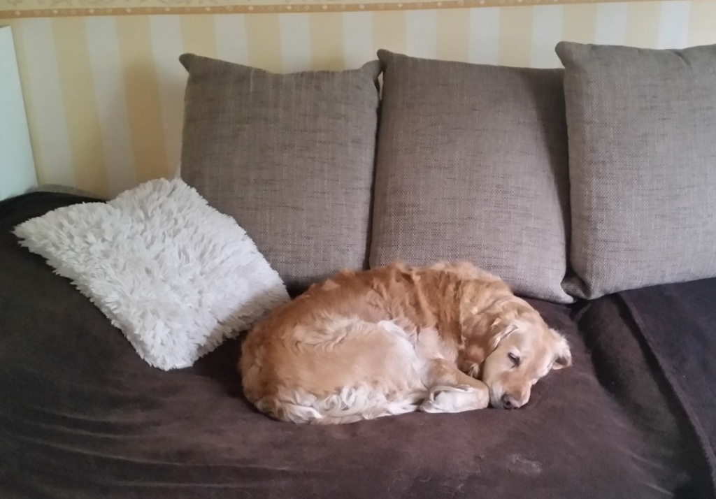 Es ist tierisch heiß und während draußen Segende Hitze herrscht, schläft Sweet Amber älteste Hündin seelenruhig im Wohnzimmer auf der Couch. Habe es für Euch festgehalten.