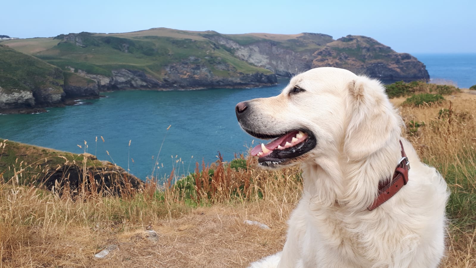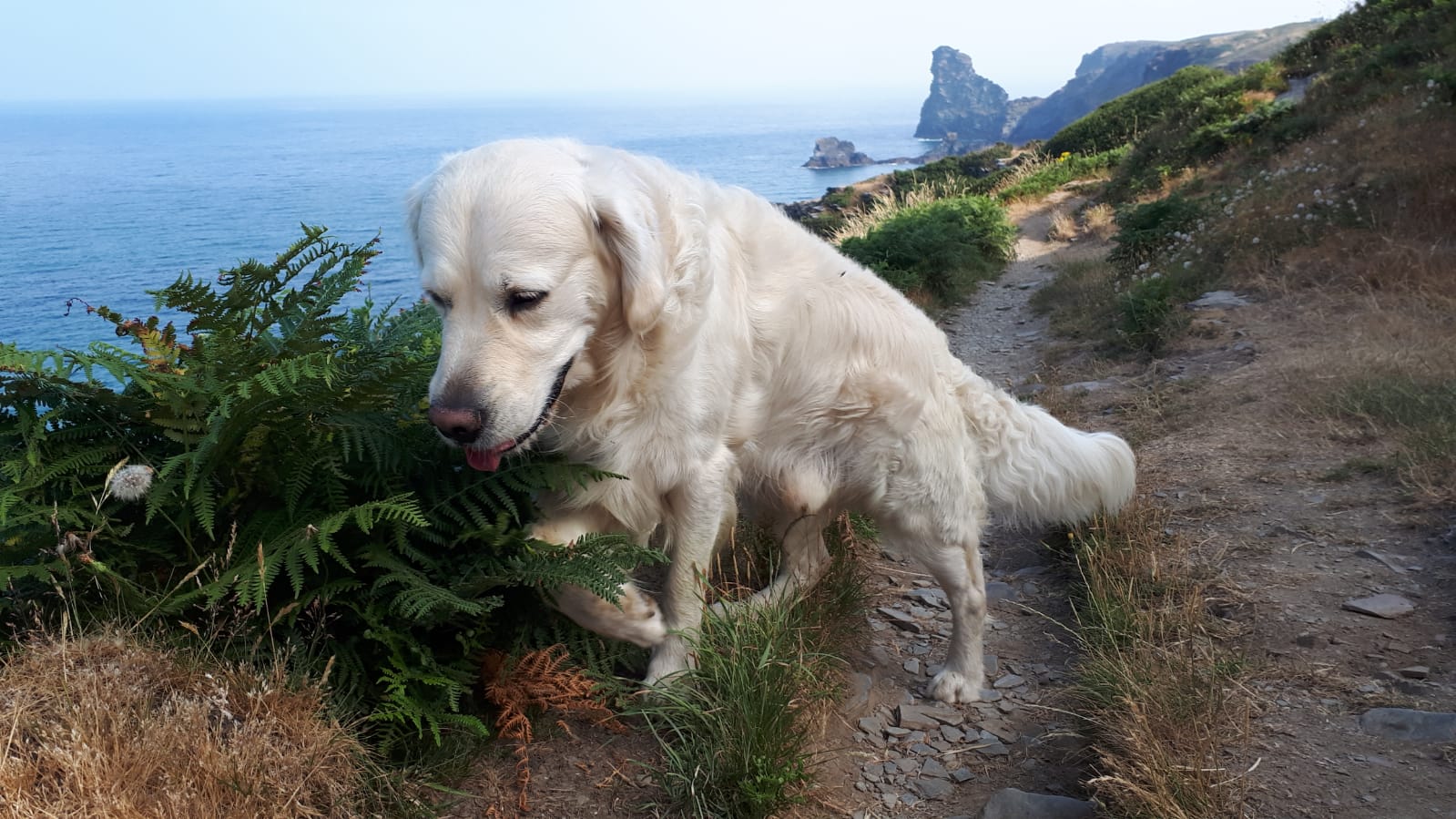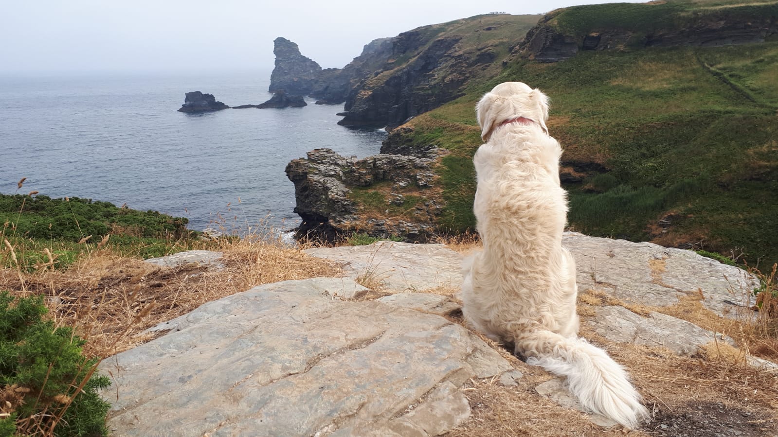 „Liebe Anna Maria, wir befinden uns an der Steilküste von Cornwall und ich mache lange Wanderung mit Elvis. Er ist ein richtiger Bergsteiger geworden und versucht immer eine Abkürzung zum Strand über did Klippen zu nehmen. Ich denke viel an Dich und Deine Wanderungen in Bayern. Die Landschaft hier ist atemberaubend schön, und ich singe aus voller Brust, wenn ich mit Elvis ganz allein über die felsigen Wege kraxele. Das macht mich glücklich.