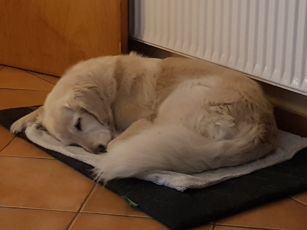 Hier ein Foto von heute Morgen. So schön hat Bonnie geschlafen, als ich sehr sehr früh an meinem Buch gearbeitet habe: