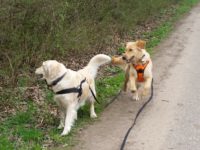 Gestern und heute waren wir wieder ziemlich viel unterwegs mit den Mädels. Diesmal begleiteten und zwei Mädchen aus Angelikas Familie Leija(3) und Marla (6). Sie waren von unseren Hunden begeistert… Da wir ländere Runde gegangen sind, haben wir für die Mädels den Bollerwagen mitgenommen. Bonita hatte schon wieder den Vogel abgeschlossen und verpasste sich selbst schwarze Socken. Ich war deutlich weniger begeistert als sie… Heute haben wir Happys neuen Freund Lion getroffen-einen Collie-Mix Welpen, der […]